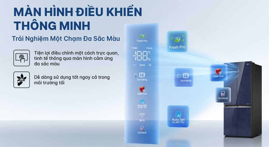 Cấp đông nhanh, Làm lạnh nhanh Đèn led ít tỏa nhiệt, bền và tiết kiệm điện Chức năng Holiday ngăn ngừa nấm mốc Làm đá tự động |