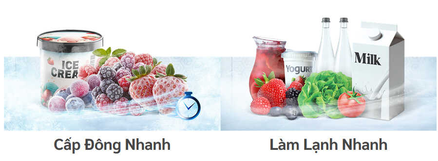 - Chế độ Cấp Đông Nhanh cho phép làm đông thực phẩm một cách mạnh mẽ và nhanh chóng, nhờ hệ thống kiểm soát nhiệt độ ngăn đông tự động. Tính năng này giúp quá trình cấp đông nhanh hơn 15% so với thông thường*, nhờ đó giữ trọn độ tươi ngon, màu sắc tự nhiên và hàm lượng dinh dưỡng trong từng loại thực phẩm, mang lại sự an tâm cho cả gia đình.