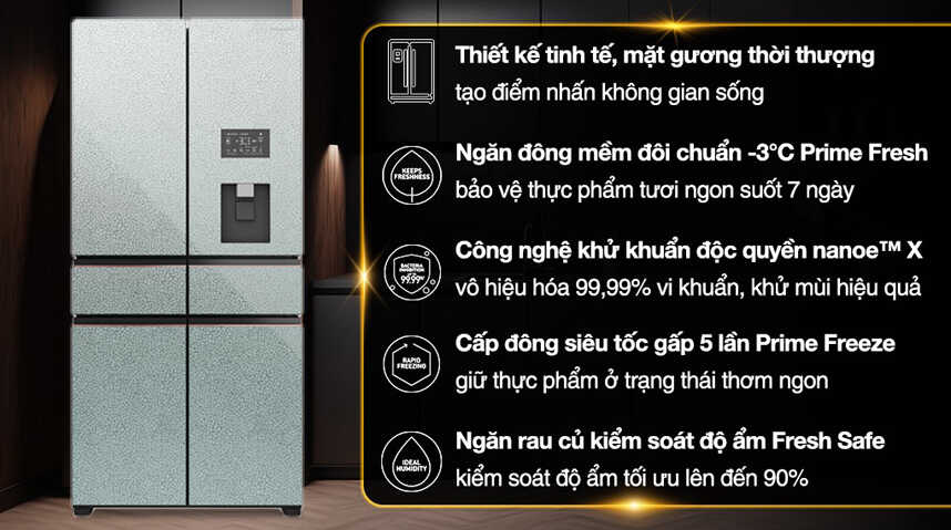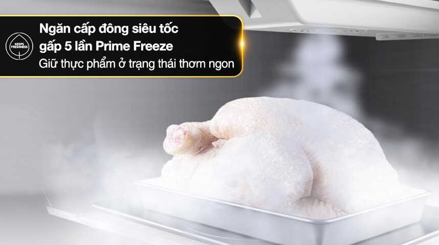 - Ngăn Prime Freeze thế hệ mới cấp đông siêu tốc, nhanh hơn gấp 5 lần so với ngăn đông thông thường. Công nghệ này giúp ngăn chặn hiệu quả sự phá hủy tế bào thực phẩm, hạn chế biến chất và chảy nước sau khi rã đông, giữ cho thực phẩm luôn giữ được trạng thái tươi ngon, thơm ngon như ban đầu, đảm bảo chất lượng và hương vị tối ưu cho bữa ăn của gia đình bạn.