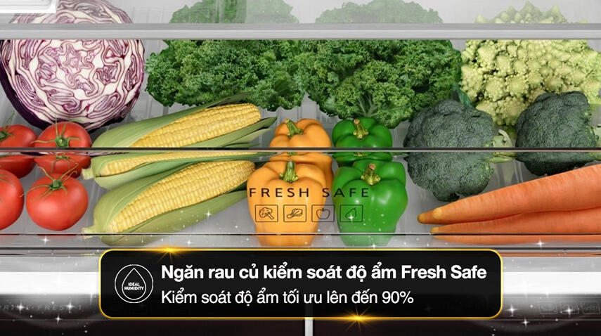 - Ngăn rau củ Fresh Safe trang bị bộ lọc kiểm soát độ ẩm tối ưu lên đến 90%, cùng dung tích rộng 58 lít giúp giữ cho trái cây và rau ăn lá luôn tươi ngon, mọng nước lâu hơn. Môi trường bảo quản lý tưởng này giúp duy trì độ tươi và kéo dài thời gian sử dụng của thực phẩm, đảm bảo dinh dưỡng và hương vị cho gia đình bạn mỗi ngày.