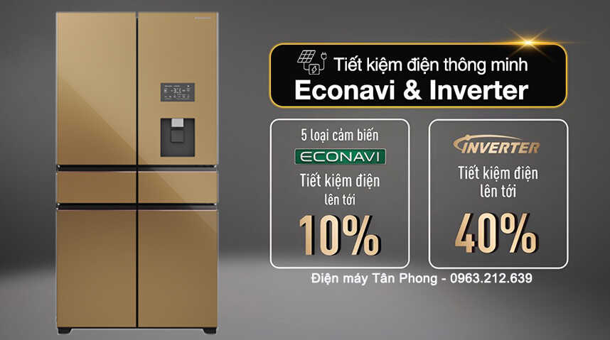 - Cảm biến Econavi tự động điều chỉnh công suất dựa trên nhiệt độ môi trường và bên trong tủ, đồng thời ghi nhớ tần suất sử dụng của bạn, giúp tối ưu hóa hiệu suất hoạt động và tiết kiệm đến 10% điện năng tiêu thụ.