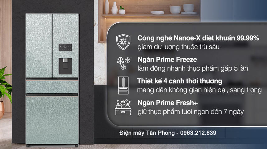 Thiết kế tủ lạnh 4 cánh thanh lịch, mặt gương cẩm thạch sang trọng.
