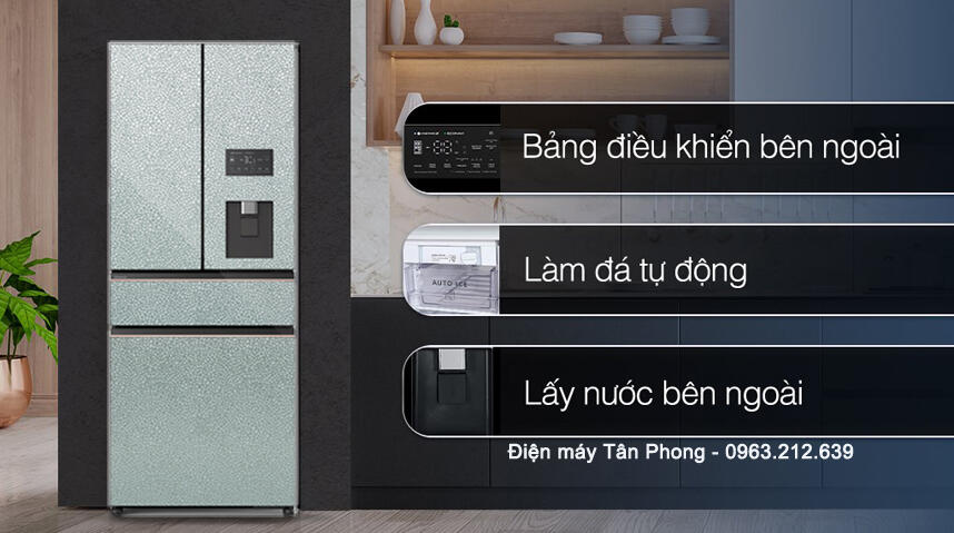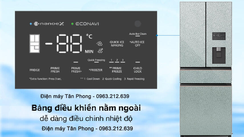 Ngăn thay đổi nhiệt độ Làm lạnh nhanh Khoá trẻ em Bảng điều khiển cảm ứng bên ngoài cửa tủ Chuông báo cửa mở quá lâu Làm đá nhanh Làm đông nhanh Làm đá tự động Lấy nước mát bên ngoài |