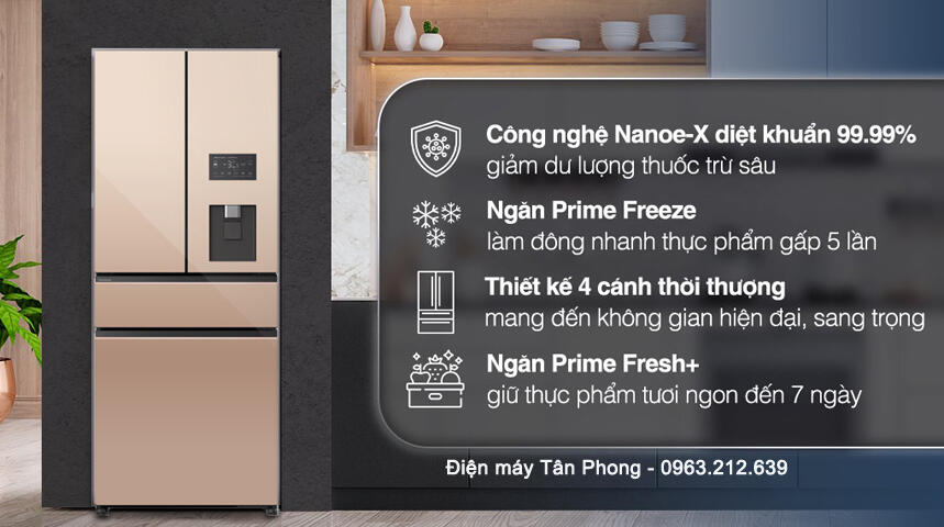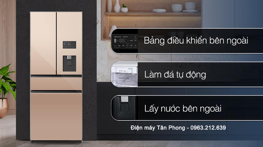 Ngăn thay đổi nhiệt độ Làm lạnh nhanh Khoá trẻ em Bảng điều khiển cảm ứng bên ngoài cửa tủ Chuông báo cửa mở quá lâu Làm đá nhanh Làm đông nhanh Làm đá tự động Lấy nước mát bên ngoài |
