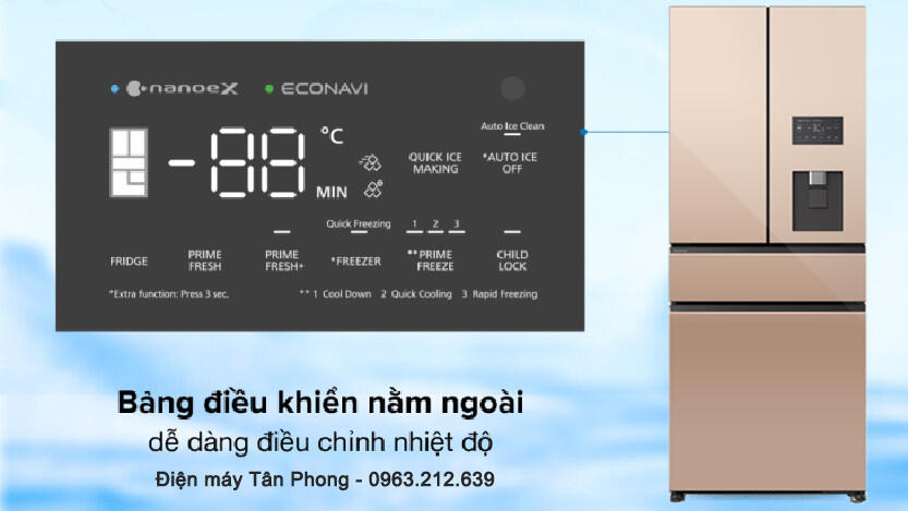Bảng điều khiển cảm ứng bên ngoài cửa tủ mang lại sự tiện lợi tối đa, cho phép bạn dễ dàng điều chỉnh nhiệt độ và các chế độ mà không cần mở cửa giúp tiết kiệm năng lượng.