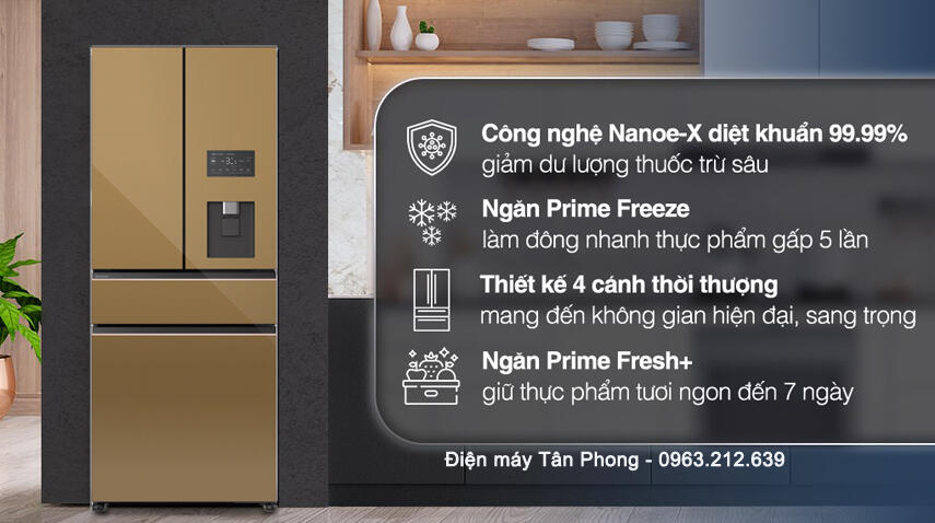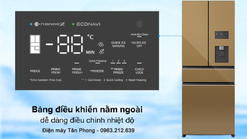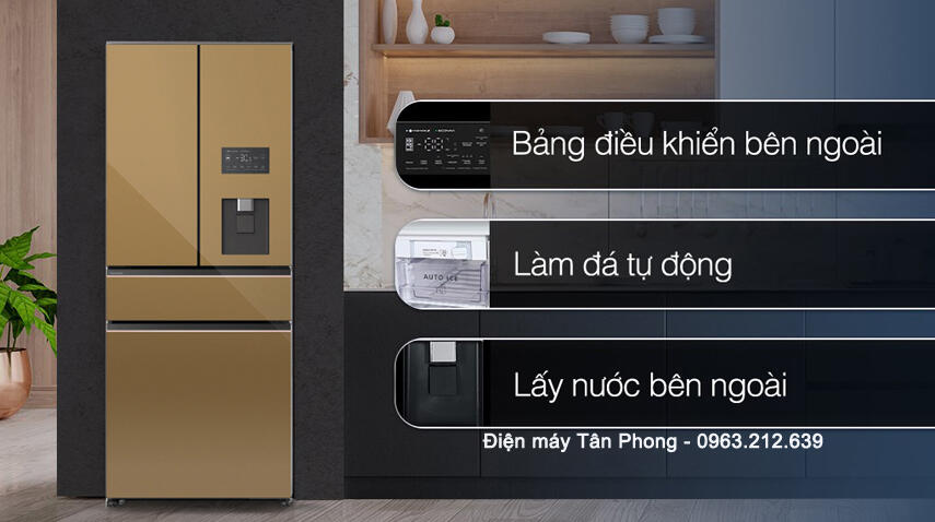 Ngăn thay đổi nhiệt độ Làm lạnh nhanh Khoá trẻ em Bảng điều khiển cảm ứng bên ngoài cửa tủ Chuông báo cửa mở quá lâu Làm đá nhanh Làm đông nhanh Làm đá tự động Lấy nước mát bên ngoài |